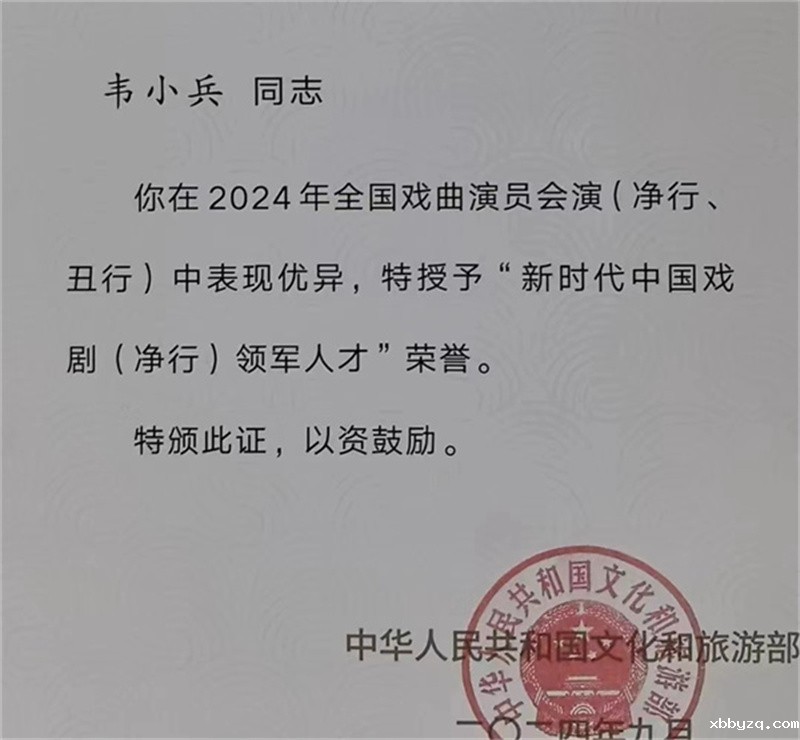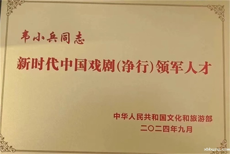 2024年9月23日晚,2024年戏曲百戏(昆山)盛典在昆山圆满闭幕。在这场汇聚了全国戏曲精英的盛会上,国家一级演员、中国戏曲梅花奖获得者、全国戏曲领军人才、宁夏演艺集团秦腔剧院花脸演员韦小兵被授予“新时代中国戏剧净行(丑行)领军人才”“新时代中国戏剧净行(丑行)中青年表演英才”称号。