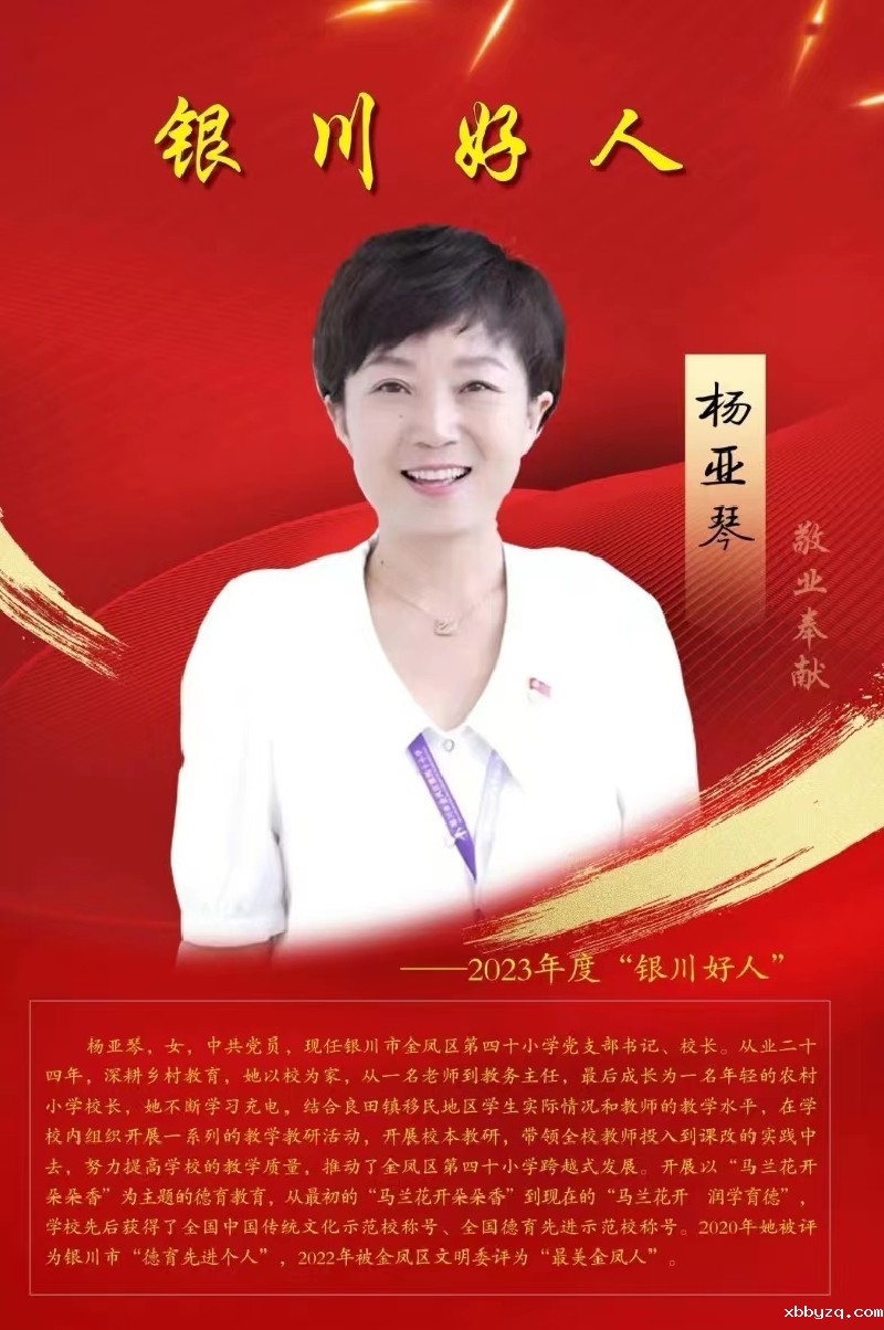 本期宣传道德模范:杨亚琴,女,45岁,银川市金凤区第四十小学党支部书记、校长。1999年至今,她一直在农村学校任教和从事学校管理工作,把教育当成事业,结合移民地区学生实际情况和教师的教学水平,在学校内组织开展一系列的教学教研活动,努力提高学校教学质量,提出“马兰花开朵朵香”的多元化评价学生理念、“马兰花开润学育德”的校园主题文化、“为学生终身发展奠基”的育人目标,学校先后获得全国中国传统文化示范校称号、全国德育先进示范校等荣誉称号。她本人被评为银川市、金凤区党代表、金凤区良田镇人大代表、宁夏回族自治区基础教育德育工作指导委员会委员、金凤区级骨干教师,多次获得银川市、金凤区优秀教育工作者、优秀教师称号和各级教学竞赛奖项。2022年1月被评为“最美金凤人”,2023年10月,被评为“银川好人”。