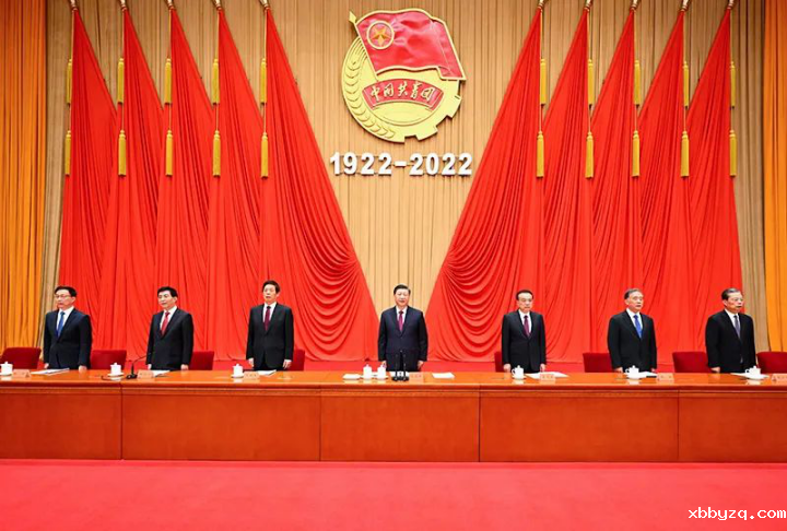 人民大会堂二层宴会厅气氛隆重热烈。主席台上方悬挂着“庆祝中国共产主义青年团成立100周年大会”会标,后幕正中悬挂团徽,团徽下方是“1922-2022”字标,10面红旗分列两侧。