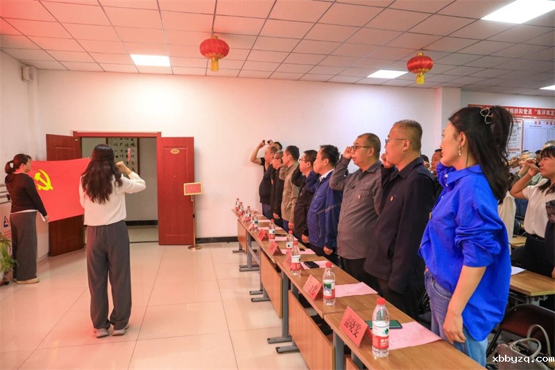 全体党员,在西夏区兴洲苑社区党委书记赵雯同志领誓下,共同重温入党誓词。