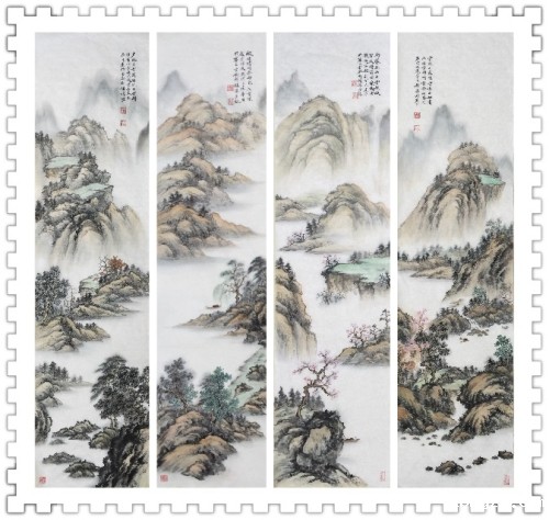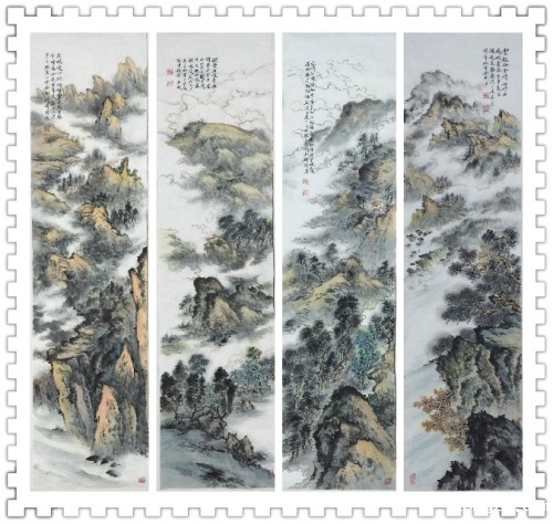 赵萍的山水画工整素雅、明快清透,她善于借用古典图式运以通景的方式描绘出山川的壮阔、悠远。在赵萍的山水画里,山石树木一切都显得分外别致,生机勃勃,似有缕缕清风、煦煦暖阳,沉醉其间。在取势上,以稳、雅、劲的形式构建出其山水舒朗、挺拔、俊秀的气势。运用细节元素的对比,无形中体现出其笔墨的娴熟,构成元素不张扬、不怪异、不凌乱,有节有序地穿插组合,让画面动静自如,泰然处之。表达手法显现出淡雅,细腻、明快,动作干净利落。