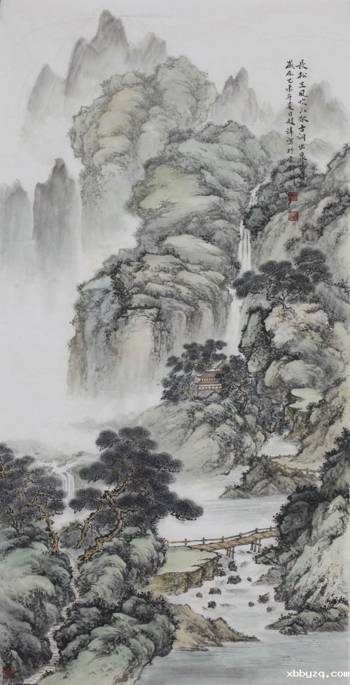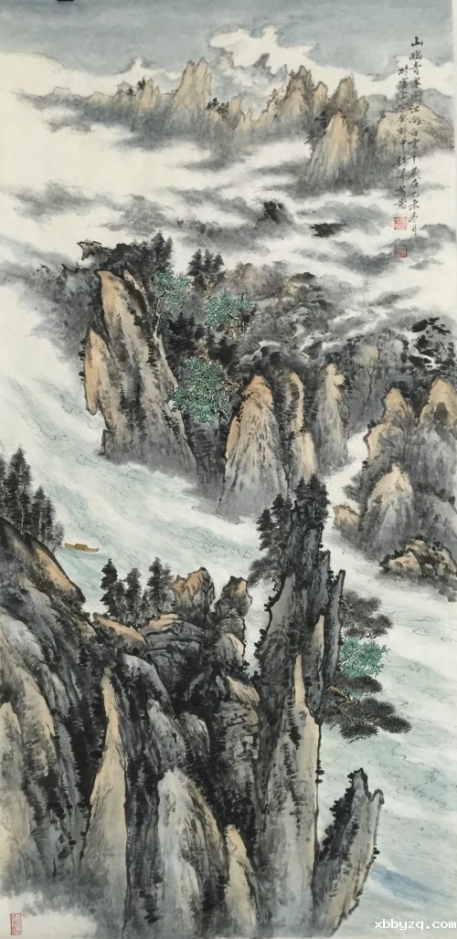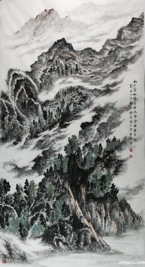 赵萍的山水画,让人感受到一种范宽式饱满的构图,山势迎面而来,瀑布浓缩为一条白色的裂隙,透过画面使她把全部精神寄托在山水的意象之中,她笔下的山川小溪,云烟雾霭,都是现实与梦幻、具象与抽象的综合,更是心灵的跋涉与远游。因此,她的作品空灵、静远、浑茫、清雅。