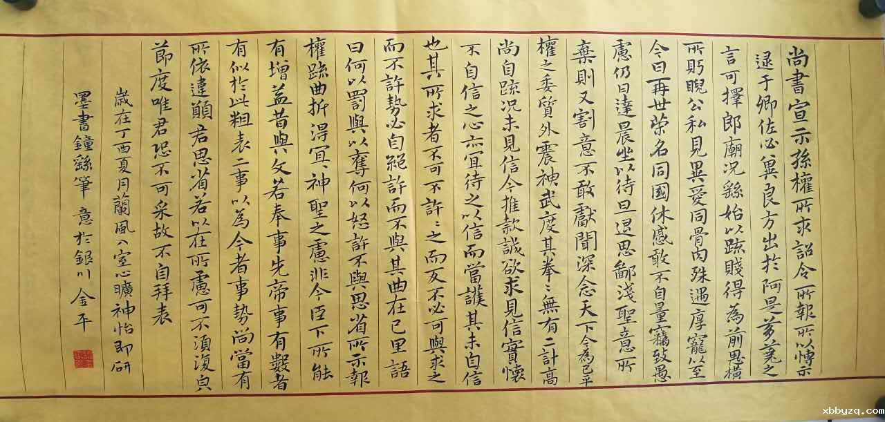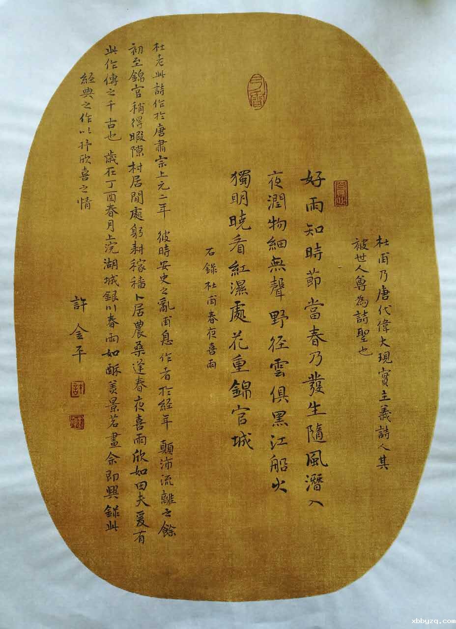 金平生于书香之家,幼承庭训,对书画有着天然的爱好。她就读于宁夏大学美术系,多年来,她孜孜不倦,刻苦钻研,临帖习字,醉心书画。其书法启学颜楷,兼以二王,近年来又遍取百家之长,笔法自然,气韵连贯,婉转天成。其画也颇见功力,独以彩墨荷花见长,一枝一叶,淡雅纯真,一花一蕾,十分灵动。其悟学书道,钟情丹青,二者兼得,诗书画一体。同时她也对诗词音律及文学兴趣很浓,所撰写的论文、诗词歌赋见诸多家报刊。如这首《丙申冬夜抒怀》,写出了其作为女性细腻的情思及高雅的格调。