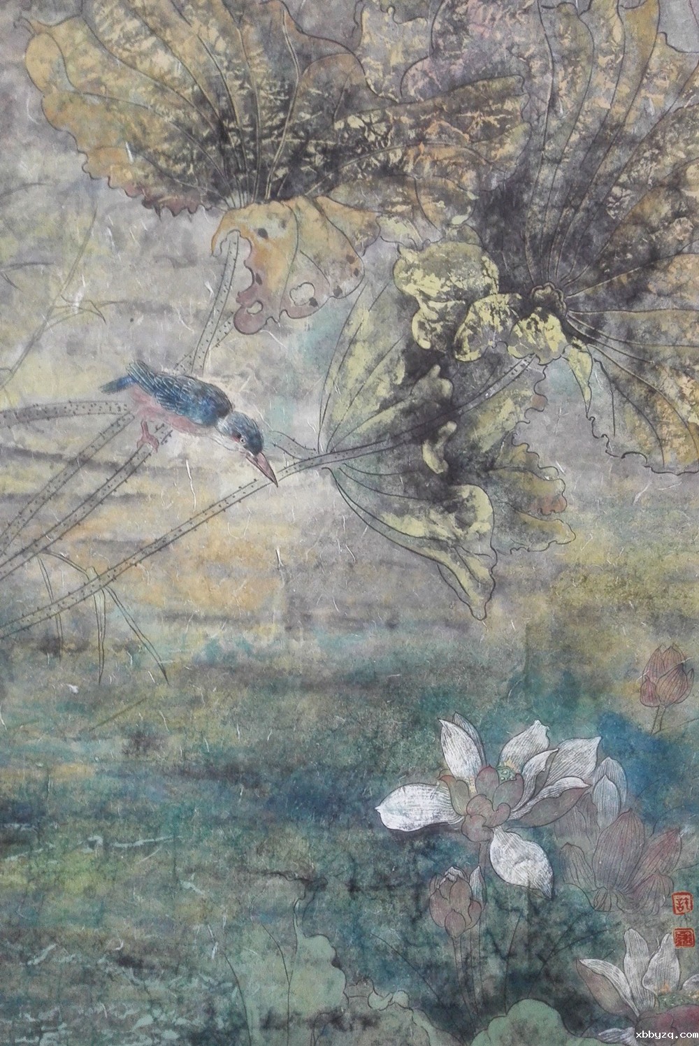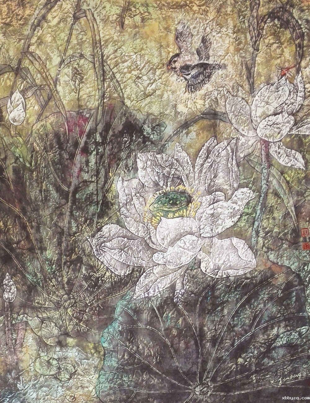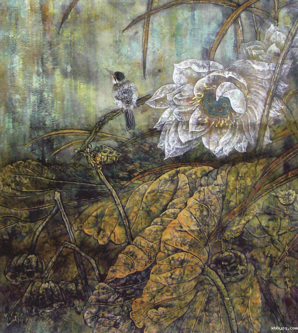 从金平的一系列《荷韵》作品中可以看出其探索的足迹和她竭力寻觅一种既保留生宣纸呈露笔趣墨韵的形式美,又通过适度搭配国画矿物色鲜艳色彩,使水墨重彩各显其妙,形成具有崭新美感的彩墨艺术表现语言。金平用自己的天赋和才能,创造了具有鲜明个性风格的彩墨艺术,向我们奉献出一幅幅富有温柔、细致情调的画面,让我们能够暂时忘掉现实生活的种种烦恼,跟随着她走进妩媚瑰丽的画面,分享她所展示给我们的优雅情怀以及她所营造的“飘飘乎如遗世独立,羽化而登仙 ”的诗情画意。